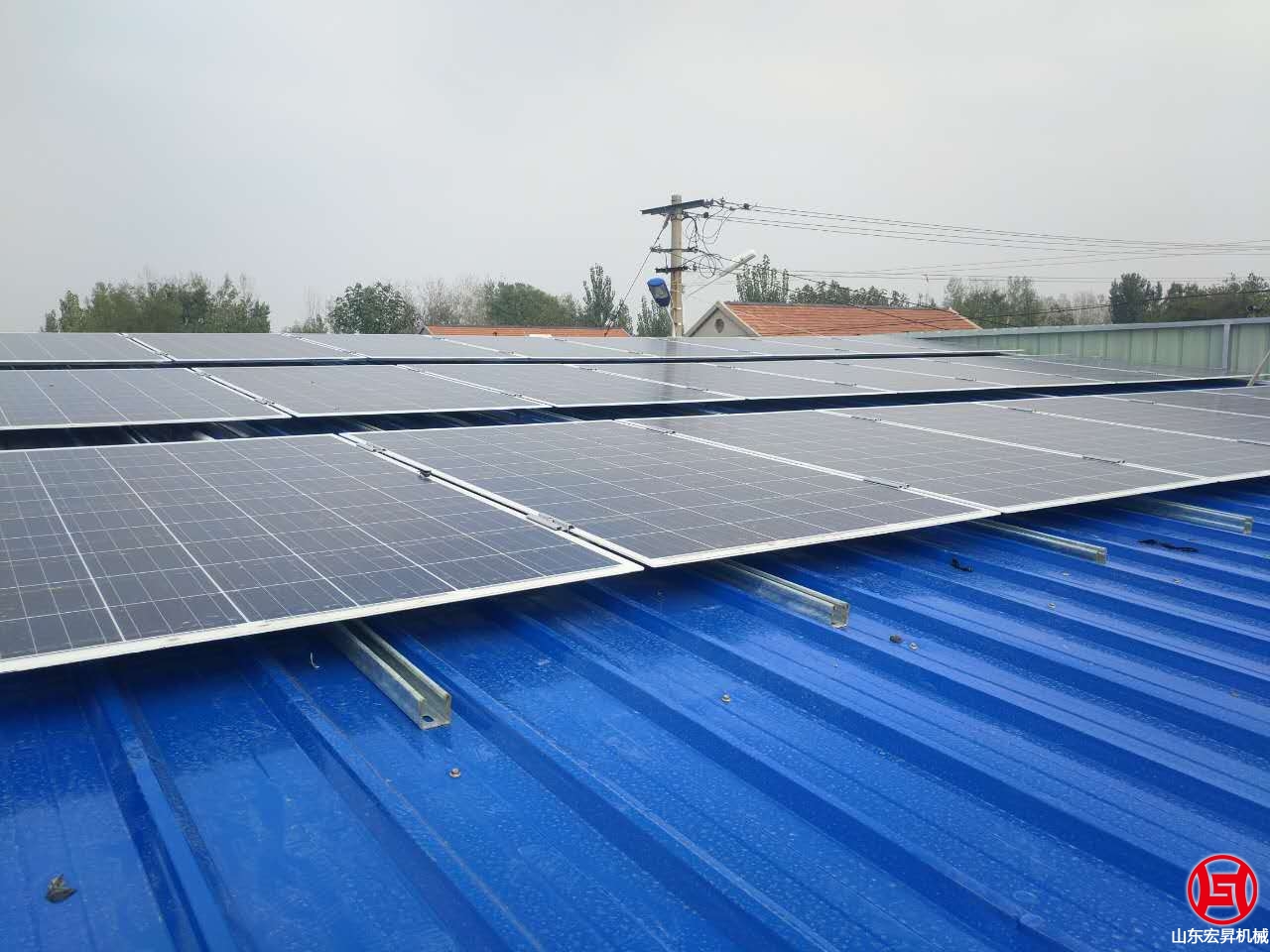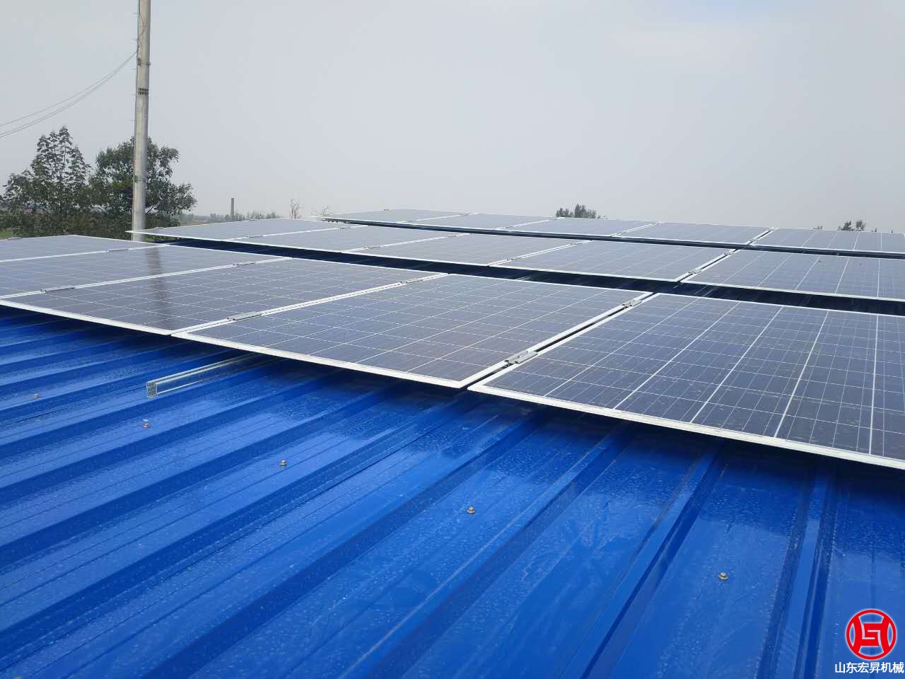2016年10月,山東宏昇中標峽山區太保莊街道的扶貧項目,為某村搭建彩鋼瓦鋼結構大棚一個,10KW光伏發電系統一套,本系統采用265高效率A級雙玻組件,壽命可達30年。7oL山東宏昇機械科技有限公司