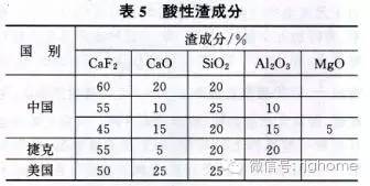 長期以來,電渣重熔一直沿用堿性渣及中性渣,對渣中SiO2含量予以限制。為了適當降低CaF2-CaO-Al2O3渣系熔渣氧離子活度,防止吸氫增氧,近年來開始在渣中加入SiO2,采用酸性渣以滿足工業發展的需要,其成分見表5。堿性渣脫磷脫硫效果良好,但它具有較高的透氣性,不可避免地將提高鋼中含氫量。隨著電渣重熔錠型的日益大型化,渣池與大氣接觸面積增加,電渣錠去氫問題日益尖銳。酸性渣雖不利于脫硫脫磷,但由于透氣性差,利于除氫。對于50~300t重的直徑1000~3000mm的大錠采用酸性渣(B<1)重熔,防止鋼中增氫效果明顯。用堿性渣重熔,氫會增至8cm3/100g,而用酸性渣重熔,則鋼中氫含量不超過2cm3/100g。另外,采用酸性渣重熔,可以改變鋼中非金屬夾雜物形態。用堿性渣重熔,鋼中夾雜物以剛玉為主(Al2O360%~90%,SiO2<20%),若用酸性渣重熔,鋼中夾雜物以硅酸鹽為主(SiO240%~60%,Al2O315%~20%),為塑性夾雜物,而易于加工。但是,使用酸性渣必須解決其電導率低引起電渣過程不穩,以及重熔含有易氧化元素的鋼時其合金元素的燒損問題。