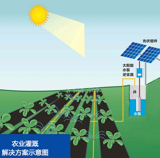 太陽能農業灌溉系統主要由水泵、太陽能水泵逆變器、光伏組件,及灌溉設備構成。該系統利用太陽能發電驅動水泵提水來替代傳統的柴油及市電灌溉系統。整套系統安裝方便可靠,節能環保、高效。可以應用在山區、村莊、農田、果園、花圃園林等。