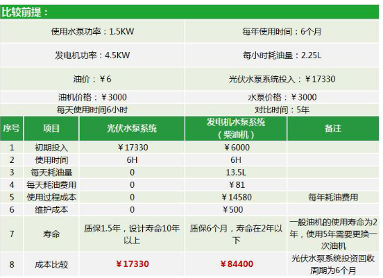 1.5KW光伏水泵系統與同功率柴油水泵系統投資對比